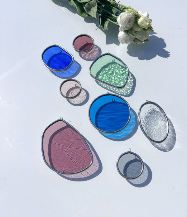 Ontdek de unieke set: Alveer. Een samenstelling van 8 Drips in de kleurencombinatie zoals afgebeeld op de foto. Elk van deze Drips is voorzien van een handig oogje, waardoor je ze moeiteloos aan de muur of aan nylondraad kunt bevestigen, waardoor ze een betoverende uitstraling krijgen voor elk raam of aan een wand.