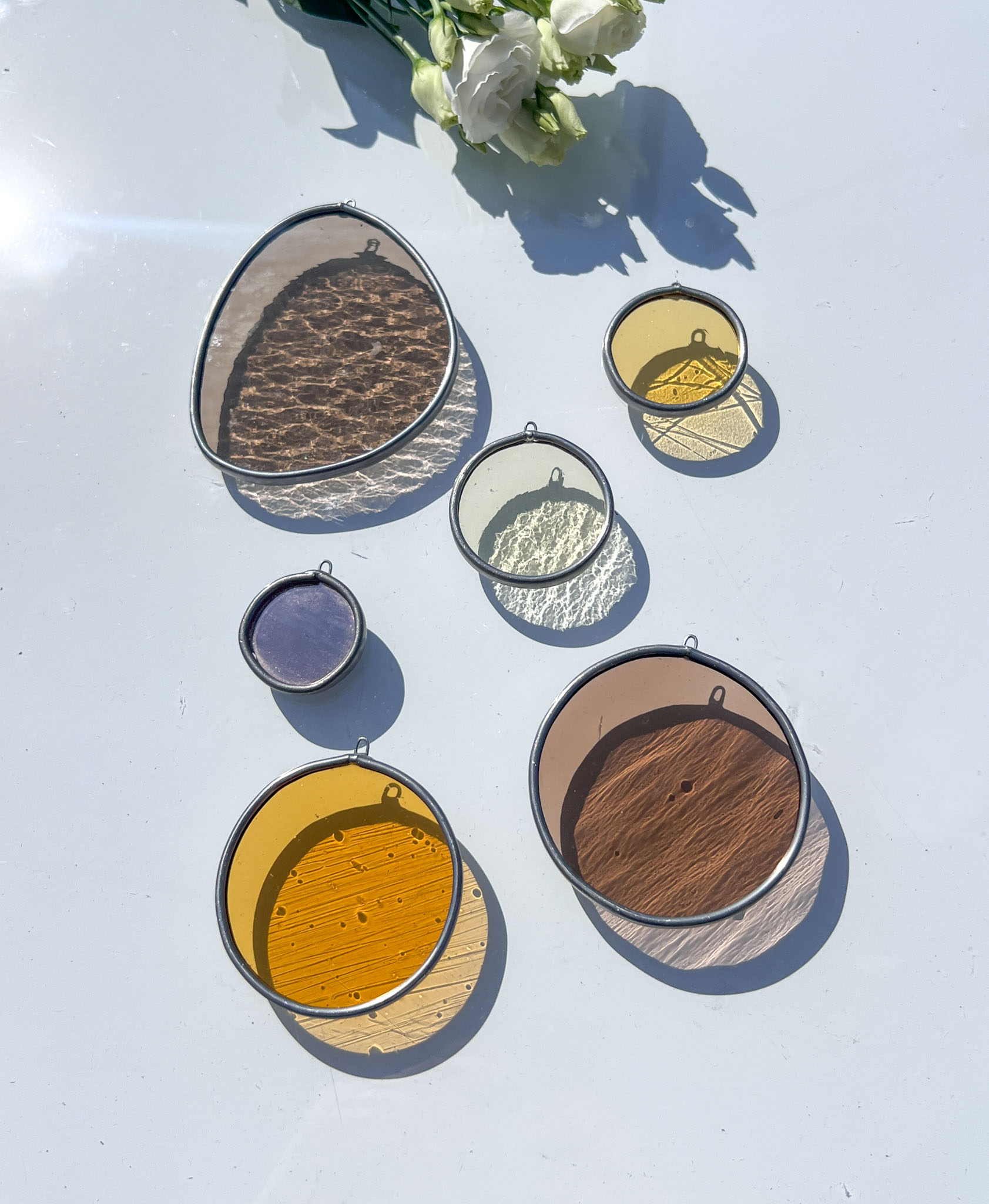 Ontdek de unieke set: Lysveer. Een samenstelling van 6 Drips in de kleurencombinatie zoals afgebeeld op de foto. Elk van deze Drips is voorzien van een handig oogje, waardoor je ze moeiteloos aan de muur of aan nylondraad kunt bevestigen, waardoor ze een betoverende uitstraling krijgen voor elk raam of aan een wand.