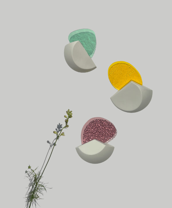 Fie 3 is een combinatie van drie wandobjecten van porselein, gecombineerd met glas. In het porselein zit een strakke snede, waar het glas in past. Daarnaast bepaal je ook bij dit product de compositie.