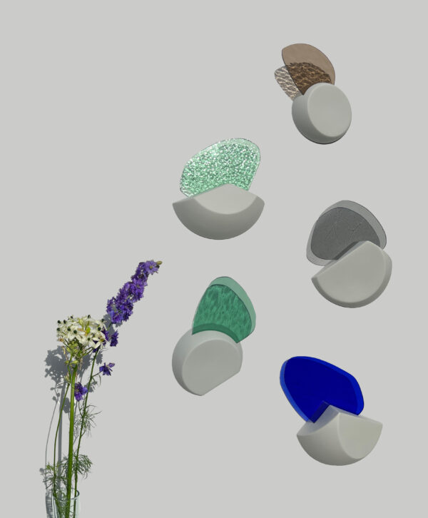 Fie 5 is een combinatie van vijf wandobjecten van porselein, gecombineerd met glas. In het porselein zit een strakke snede, waar het glas in past. Daarnaast bepaal je ook bij dit product de compositie.