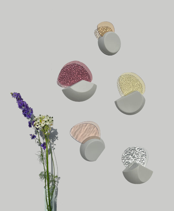 Fie 5 is een combinatie van vijf wandobjecten van porselein, gecombineerd met glas.